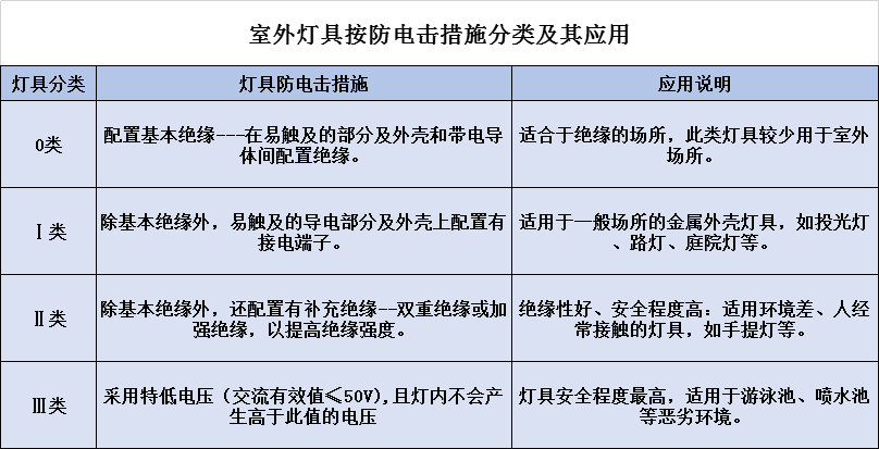 LED戶外燈具按防電擊措施分類及其應(yīng)用,可參考下表: