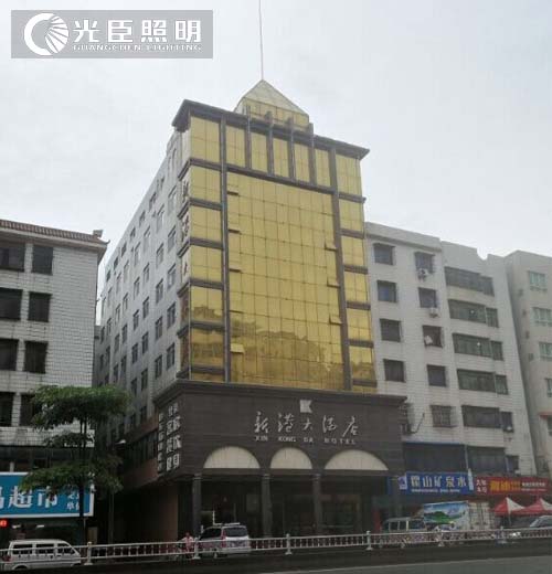 本次酒店外墻亮化選用了LED線條燈做為簡單的輪廓勾勒、LED星光燈及點光源作為墻面點綴燈具,一閃一閃的效果相當耀眼,由于墻角安裝燈具的面積有限,光臣照明特意定制一批與墻面安裝尺寸相符的LED墻角燈,發(fā)光效果十分好看。為了讓酒店塔頂顯得更加奪目,添加了金燦燦的36W金黃光洗墻燈突顯它的造型感。