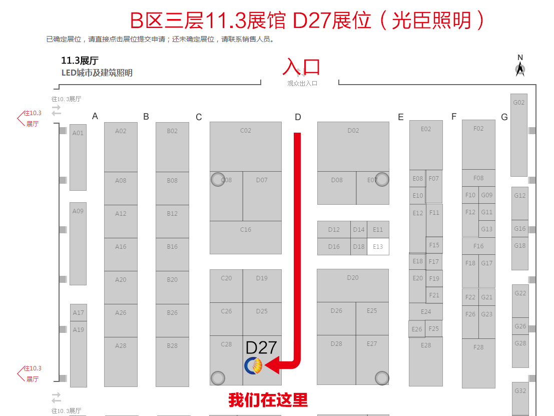 小編教您如何在看展前迅速進(jìn)場,不需排隊!不用入場費(fèi)!僅需點(diǎn)擊“我要看展”即可與客服人員取得聯(lián)系,展會之前和展會期間會有專人接待您進(jìn)場,請認(rèn)準(zhǔn)光臣照明方位圖,光臣照明展位:B區(qū)三層11.3展館 D27號,從觀眾入口直行即能找到我們哦!