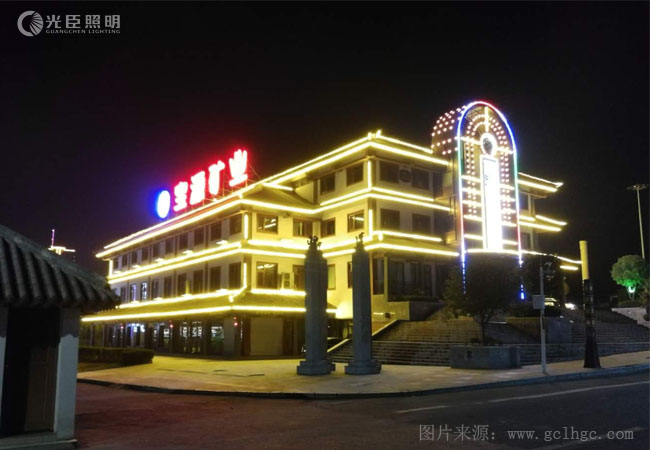 寶源礦業(yè)集團(tuán)是行業(yè)中的標(biāo)桿企業(yè),對于宏偉的頭門來說怎能少得了亮化修飾,此次工程選用外控七彩線條燈、120MM七彩漸變LED點(diǎn)光源、以及金黃光的2819線條燈、4048洗墻燈組合完成。
