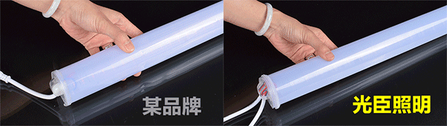 1、PC外殼:光臣照明選用的PC外殼是重量達(dá)到180g~200g的PC管(常規(guī)以180g為主,可定制200g以上重量),產(chǎn)品厚度均勻透光性及抗壓能力好。和市面上的80~90g標(biāo)價(jià)8元/米的LED數(shù)碼管質(zhì)量相比,沒有可比性。
