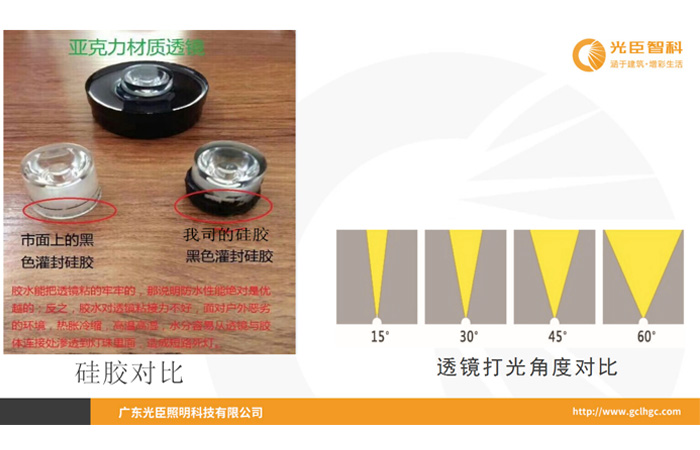 LED洗墻燈廠家光臣智科曾經(jīng)做了一個關(guān)于光學透鏡材質(zhì)與防水膠粘合程度的測試,得出結(jié)論:選劣質(zhì)的LED光學透鏡,容易造成防水膠與透鏡之間出現(xiàn)不粘合現(xiàn)象。選用PMMA(亞克力)材料的LED光學透鏡不僅是發(fā)光效果好,防水膠與其粘合程度高。